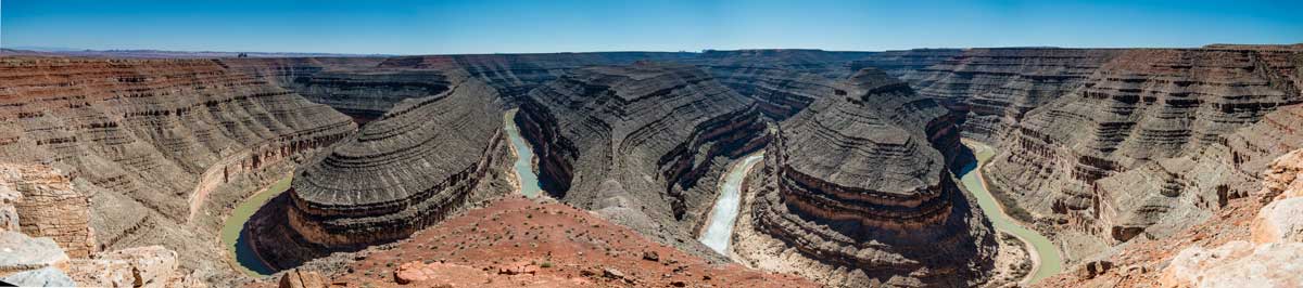 Just outside Mexican Hat, Utah, the San Juan river carves out some of the most remarkable canyons in all of the West. Rising high above the river these canyons meander slowly towards Lake Powell. Over the course of millions of years the river has created this series of Gooseneck bends that contain the river. River travel take hours just to achieve a mile or so. At times boat passengers get out and hike across the smaller goosenecks and meet the boat downstream.